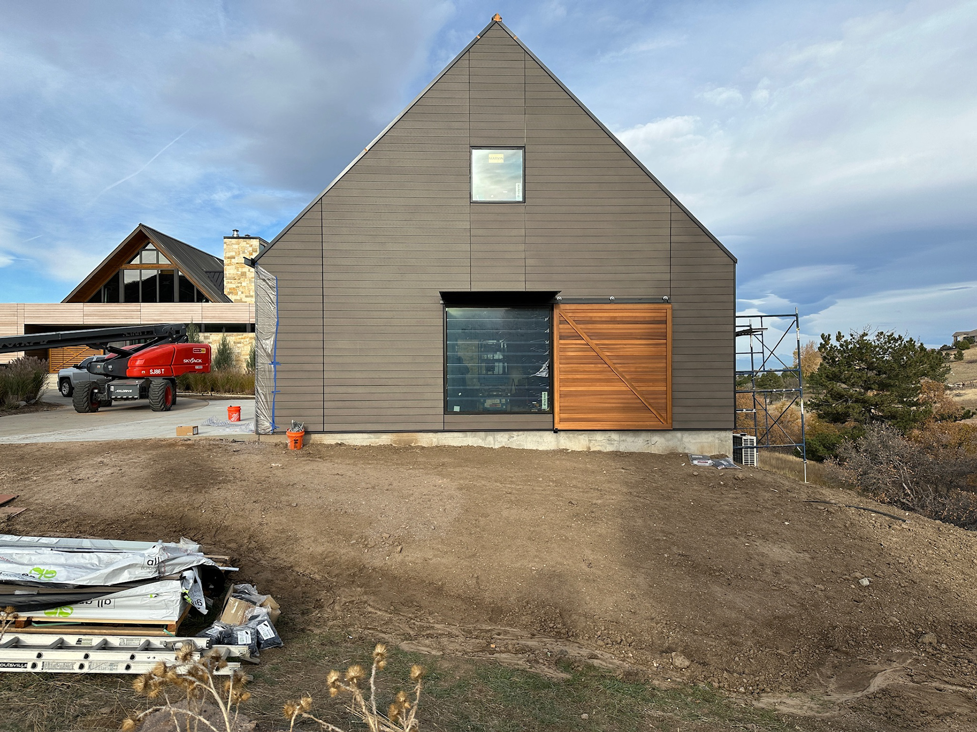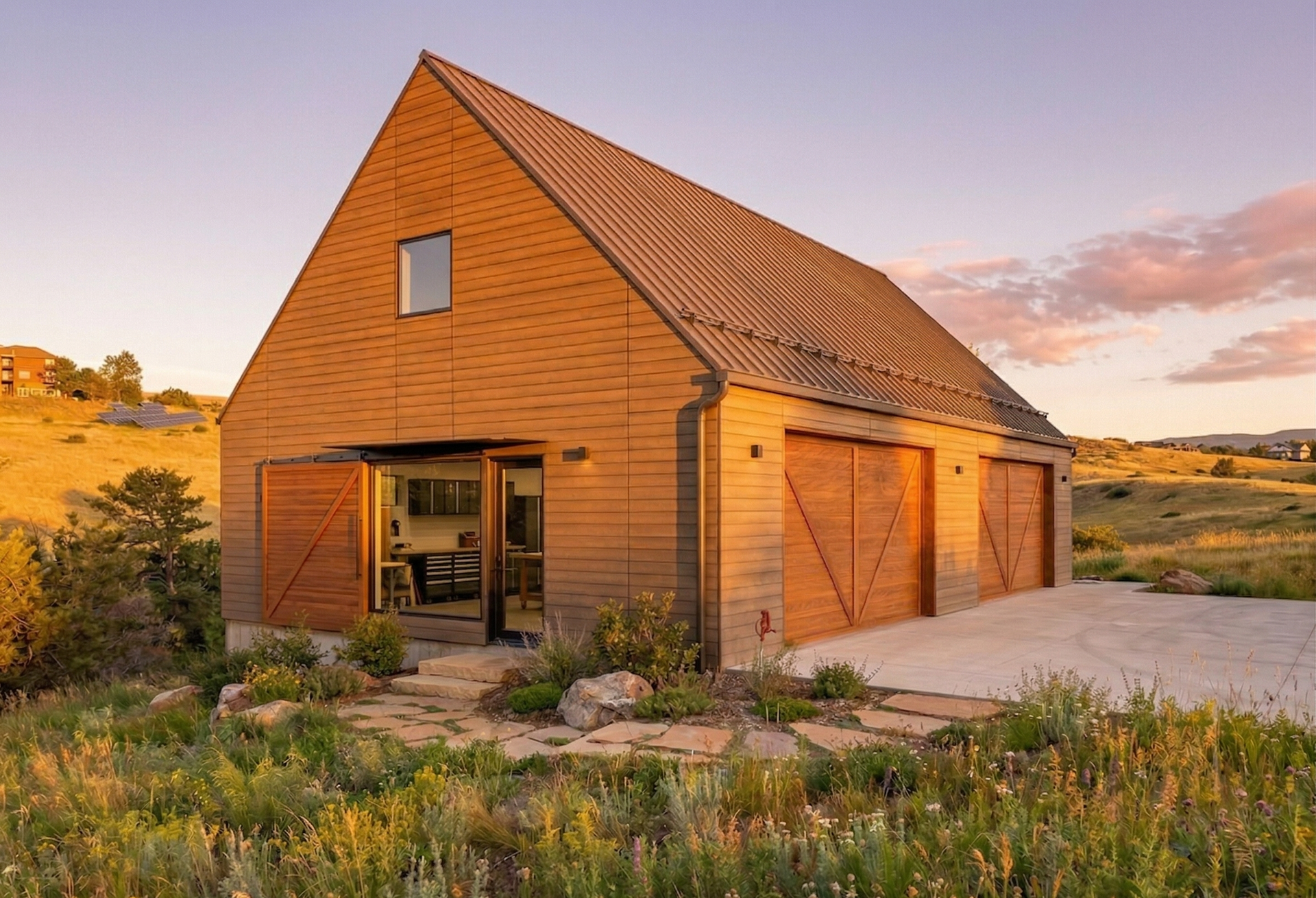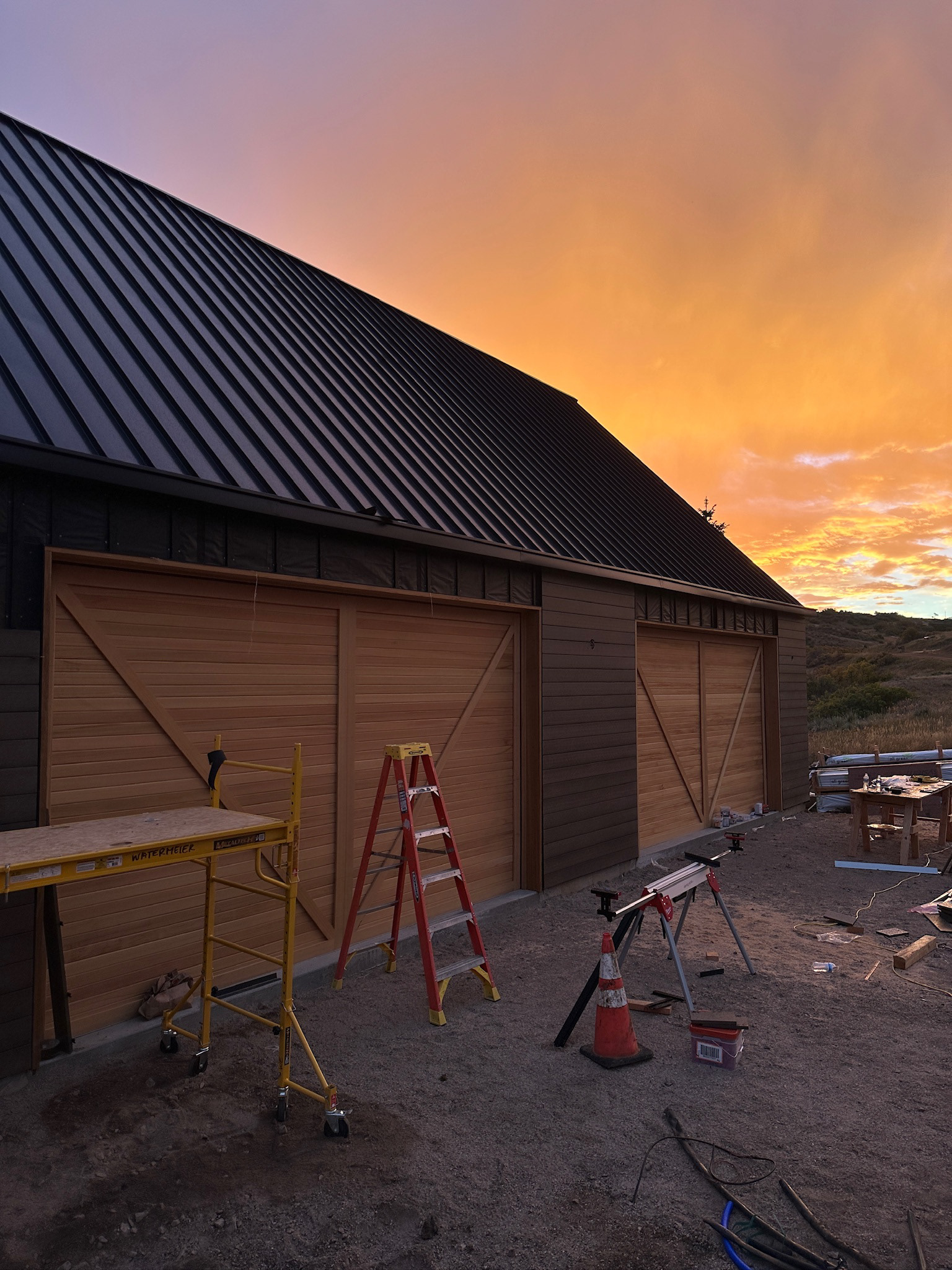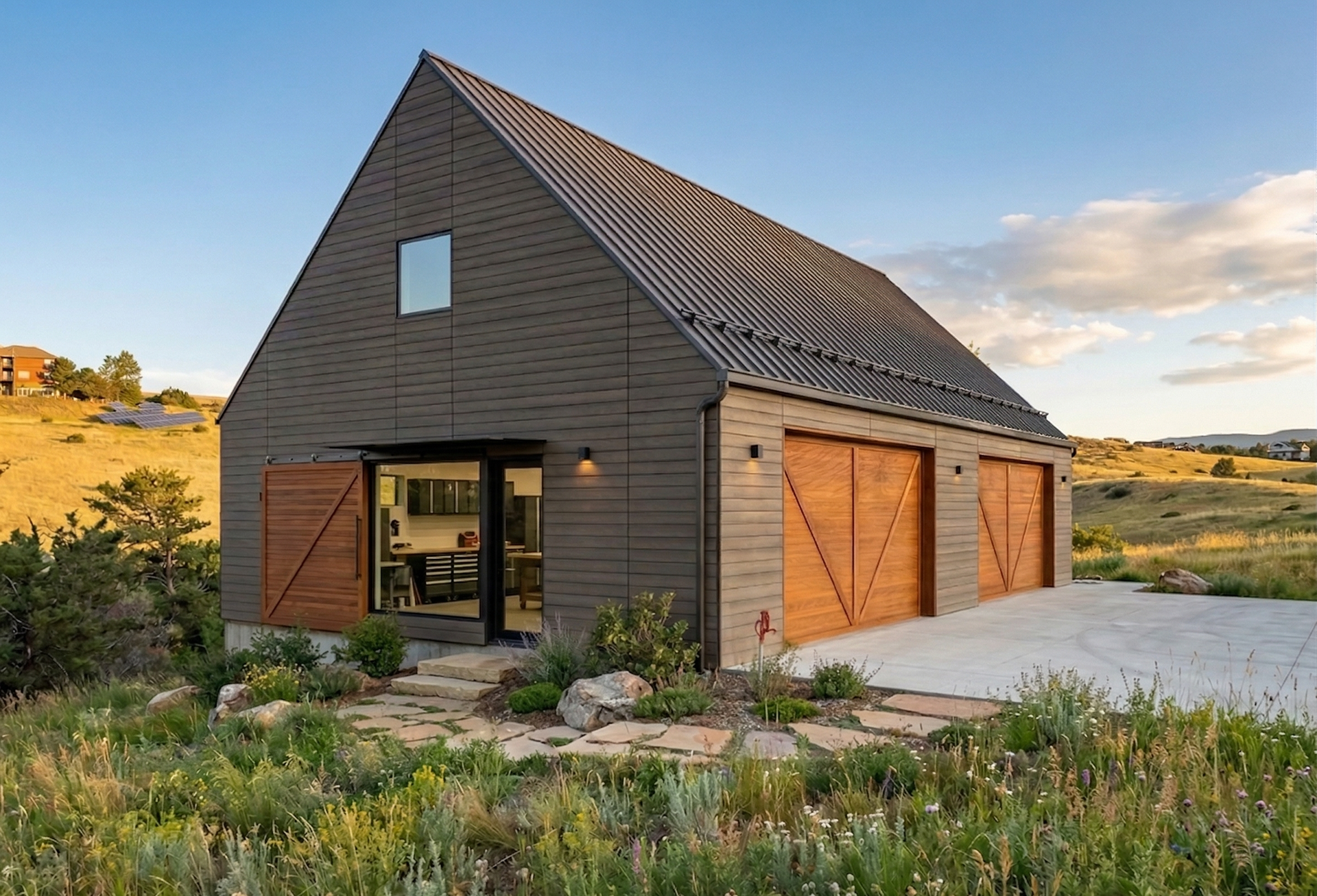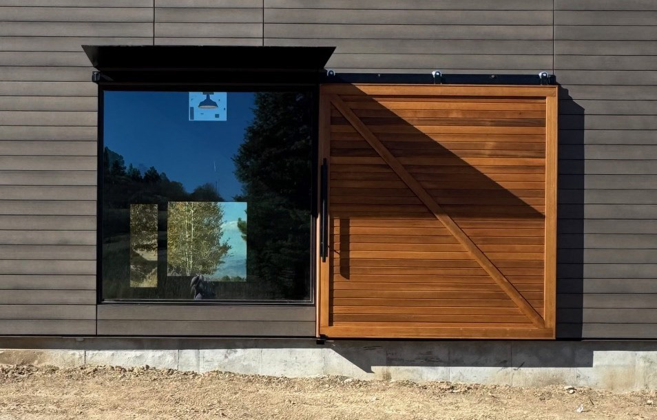 Custom design-build detached barn addition located in Lone Tree, Colorado. Several areas of the construction process was self-performed by WATERMEIER, such as the cedar barn doors fabrication and custom metal awnings and sliding door rail install. This project consists largely of sustainable material practices. The cladding is Resysta Siding, an open joint composite architectural wall cladding. Made from recyclable, wood-free composite material derived from rice husks. The material is made up of approximately 60% rice husks, 22% rock salt, and 18% mineral oil. This design formula offers superior resistance to water, insects, and decay. Another main material is the use of CVG Cedar. Clear vertical grain cedar was utilized for the garage door cladding, custom sliding barn doors we fabricated, and for the vaulted ceiling decking. The gable ends of the facade host large black powder coated awnings and barn door track systems that were designed by us, and submitted and fabricated by a local design build steel fabricator in Denver.