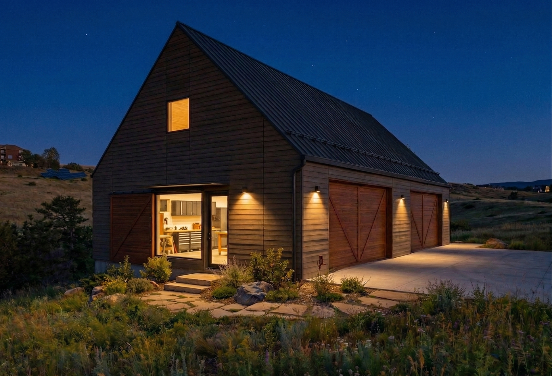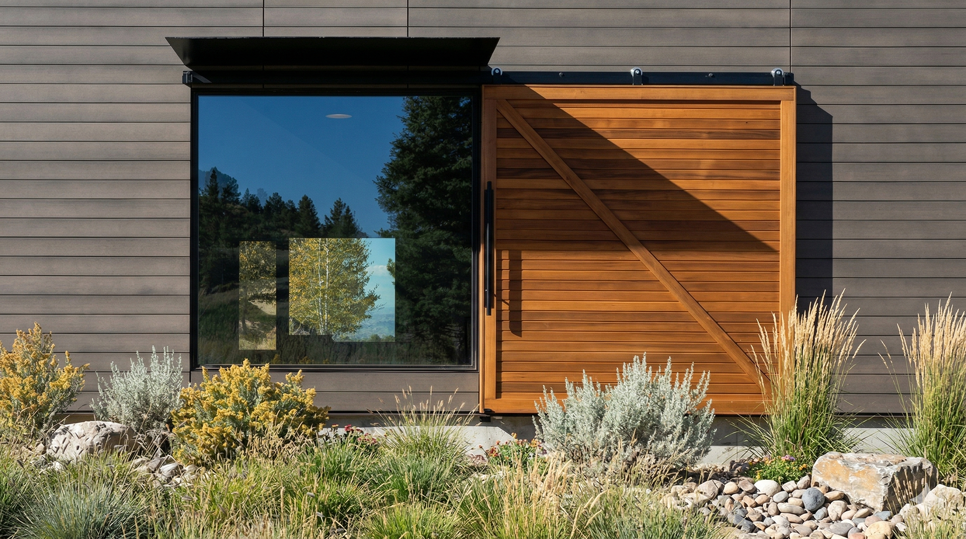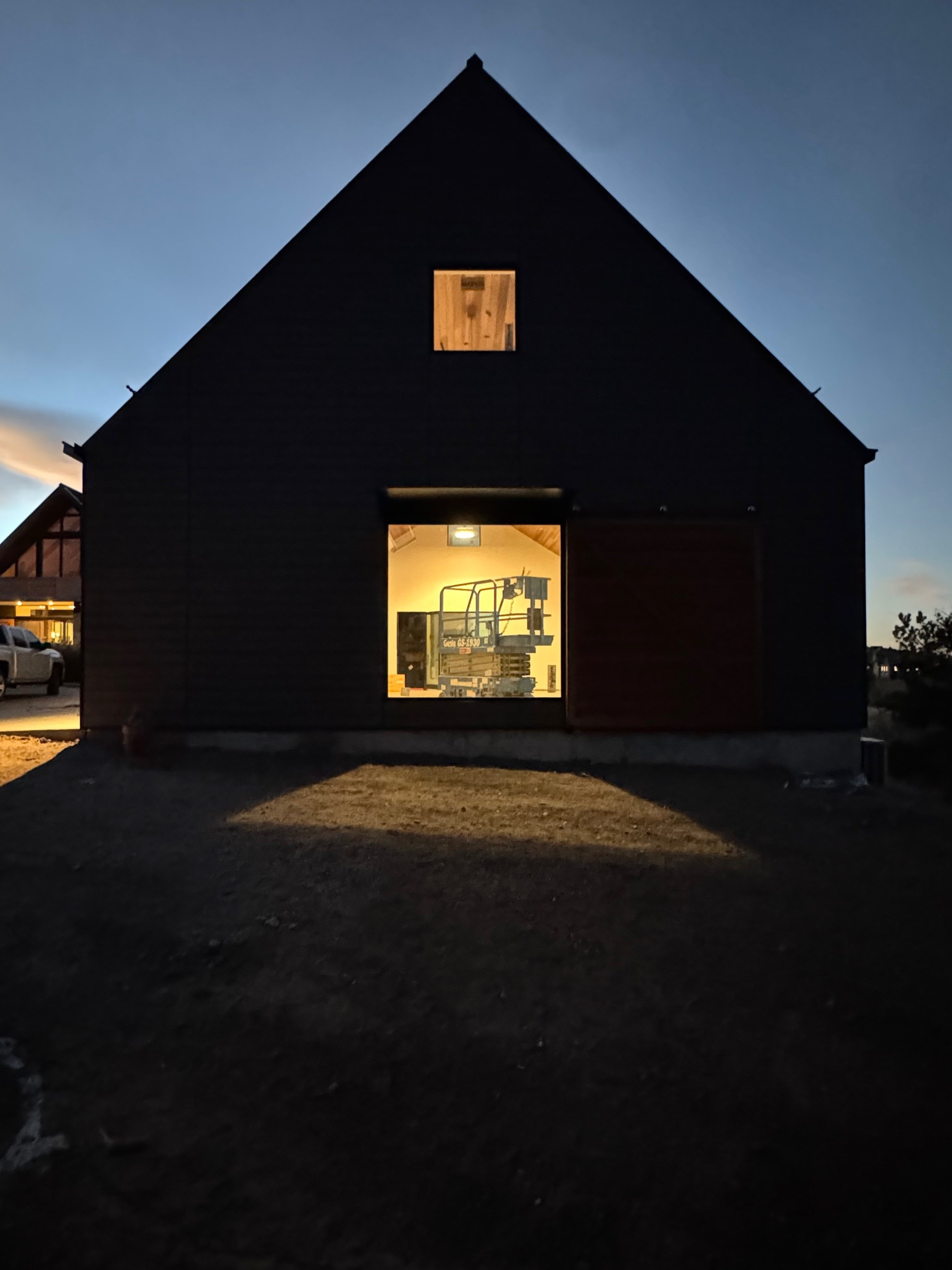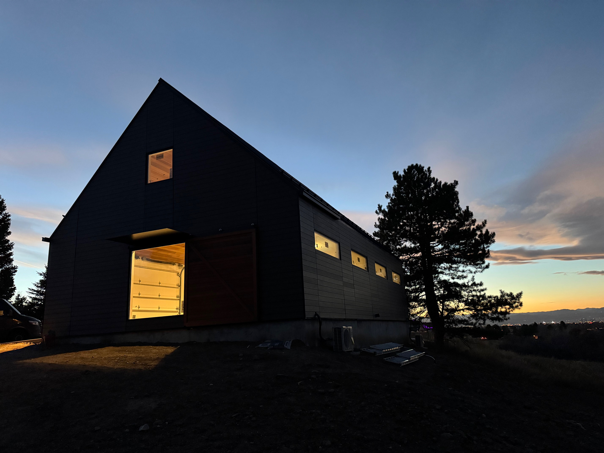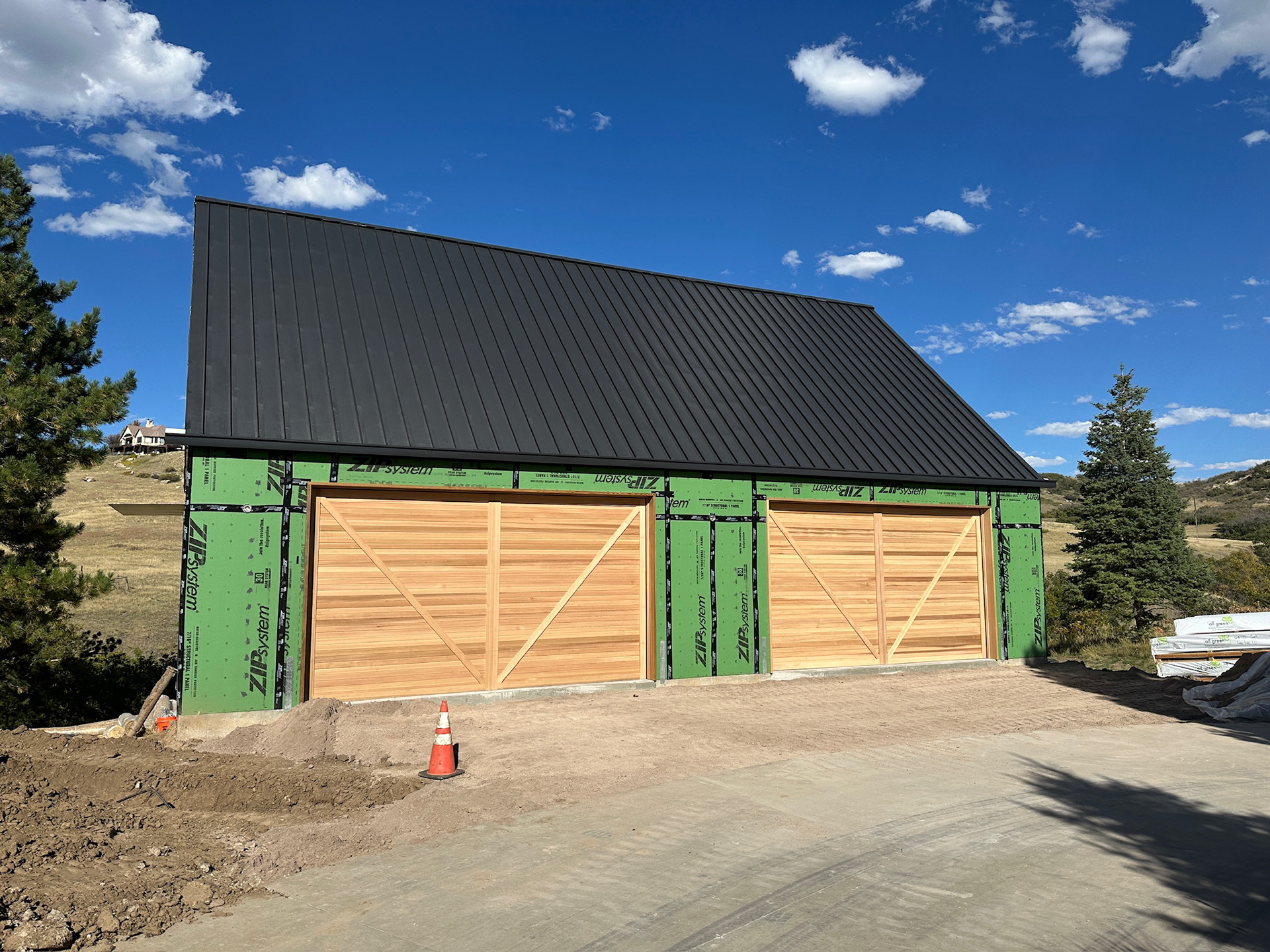 Custom design-build detached barn addition located in Lone Tree, Colorado. Several areas of the construction process was self-performed by WATERMEIER, such as the cedar barn doors fabrication and custom metal awnings and sliding door rail install. This project consists largely of sustainable material practices. The cladding is Resysta Siding, an open joint composite architectural wall cladding. Made from recyclable, wood-free composite material derived from rice husks. The material is made up of approximately 60% rice husks, 22% rock salt, and 18% mineral oil. This design formula offers superior resistance to water, insects, and decay. Another main material is the use of CVG Cedar. Clear vertical grain cedar was utilized for the garage door cladding, custom sliding barn doors we fabricated, and for the vaulted ceiling decking. The gable ends of the facade host large black powder coated awnings and barn door track systems that were designed by us, and submitted and fabricated by a local design build steel fabricator in Denver.