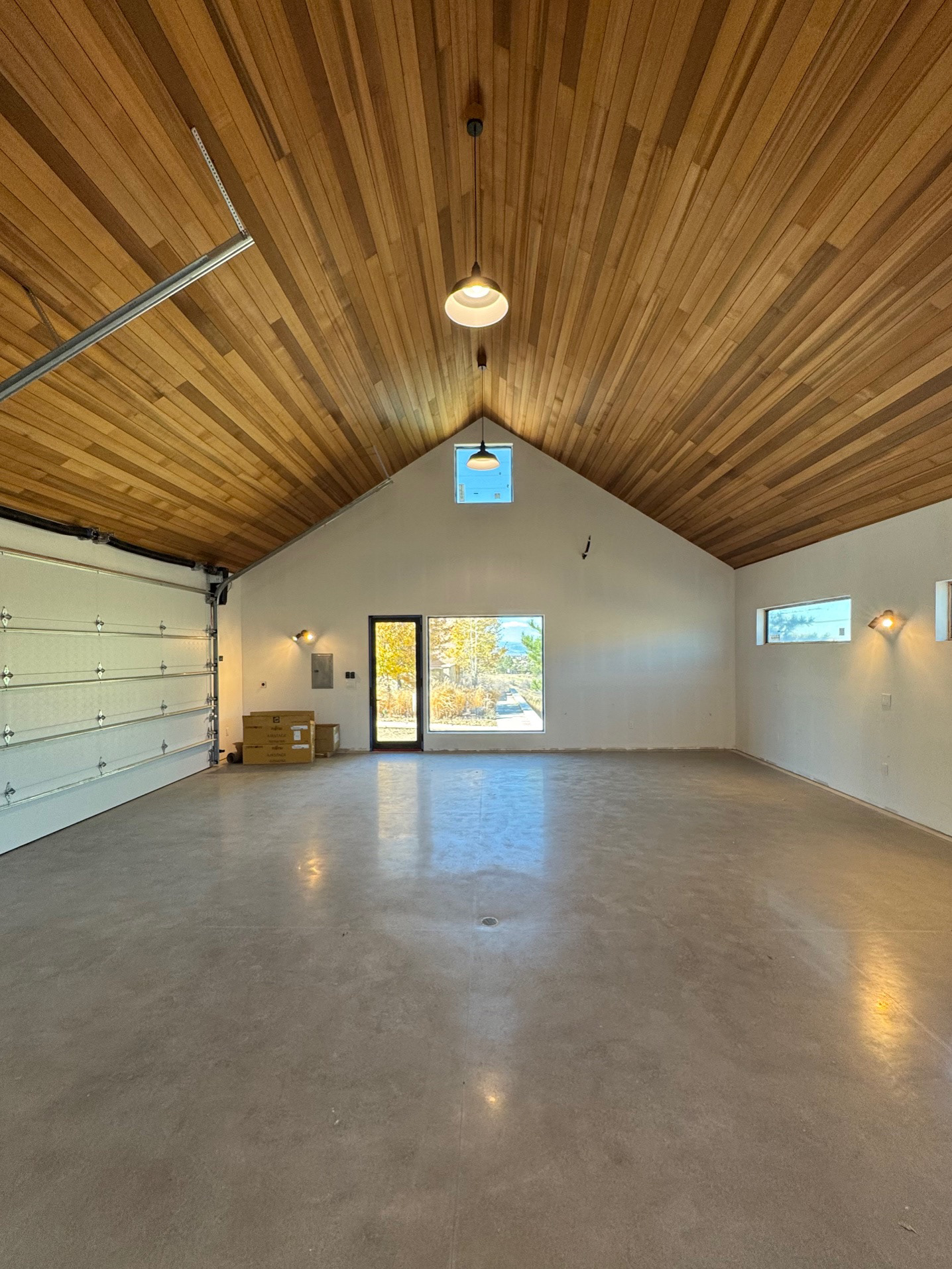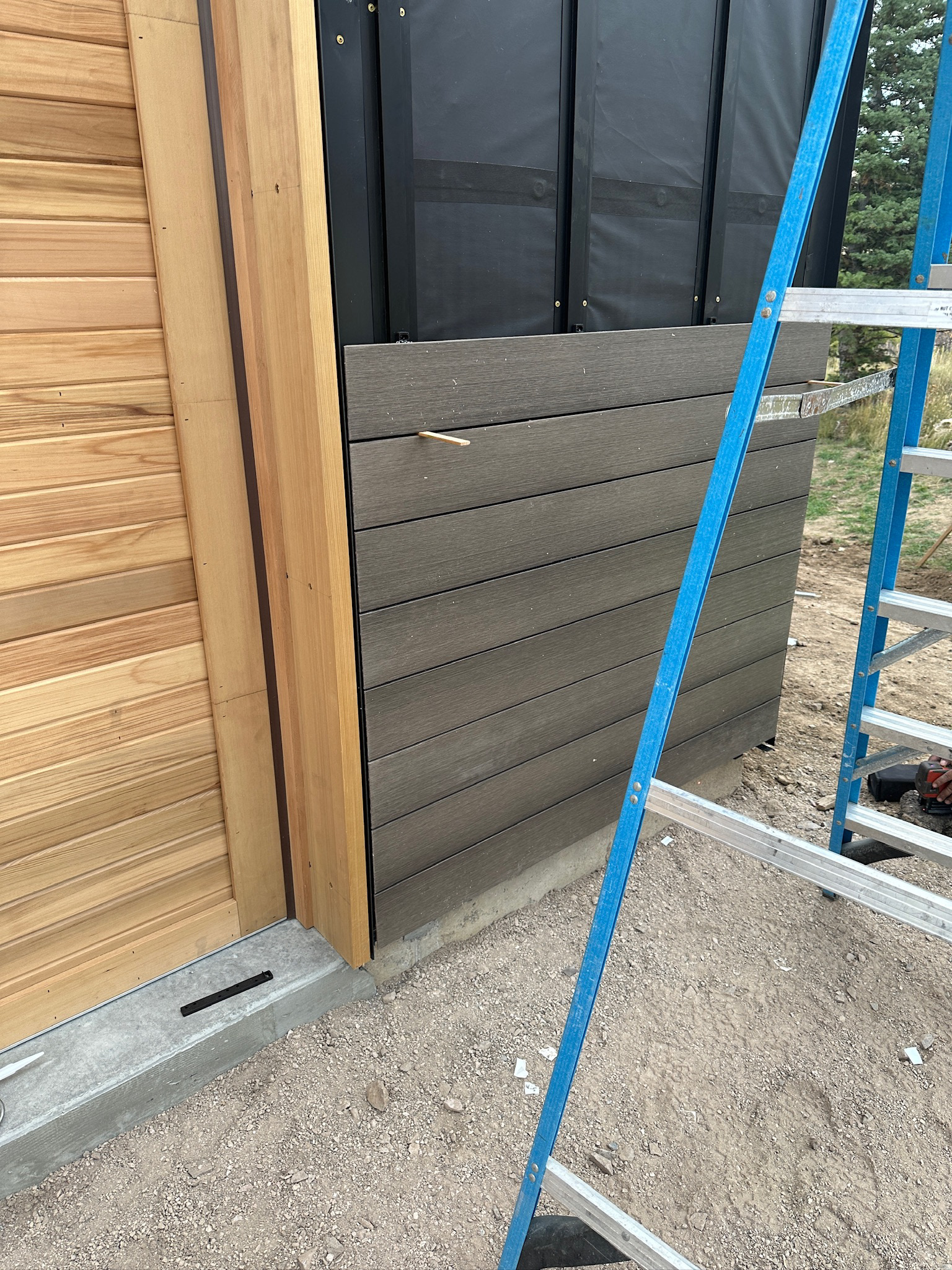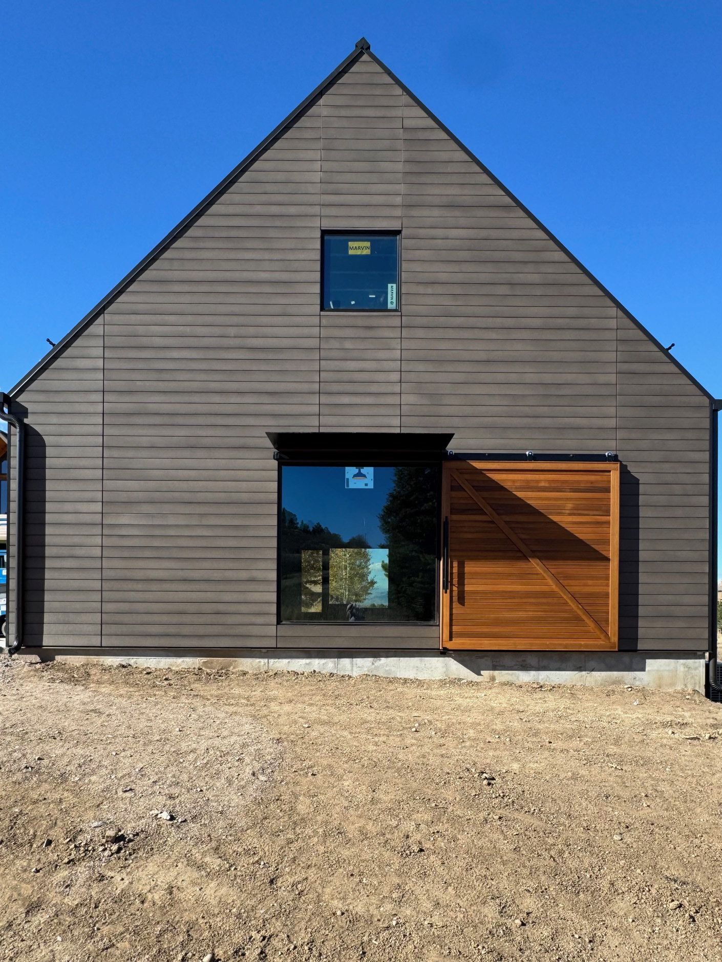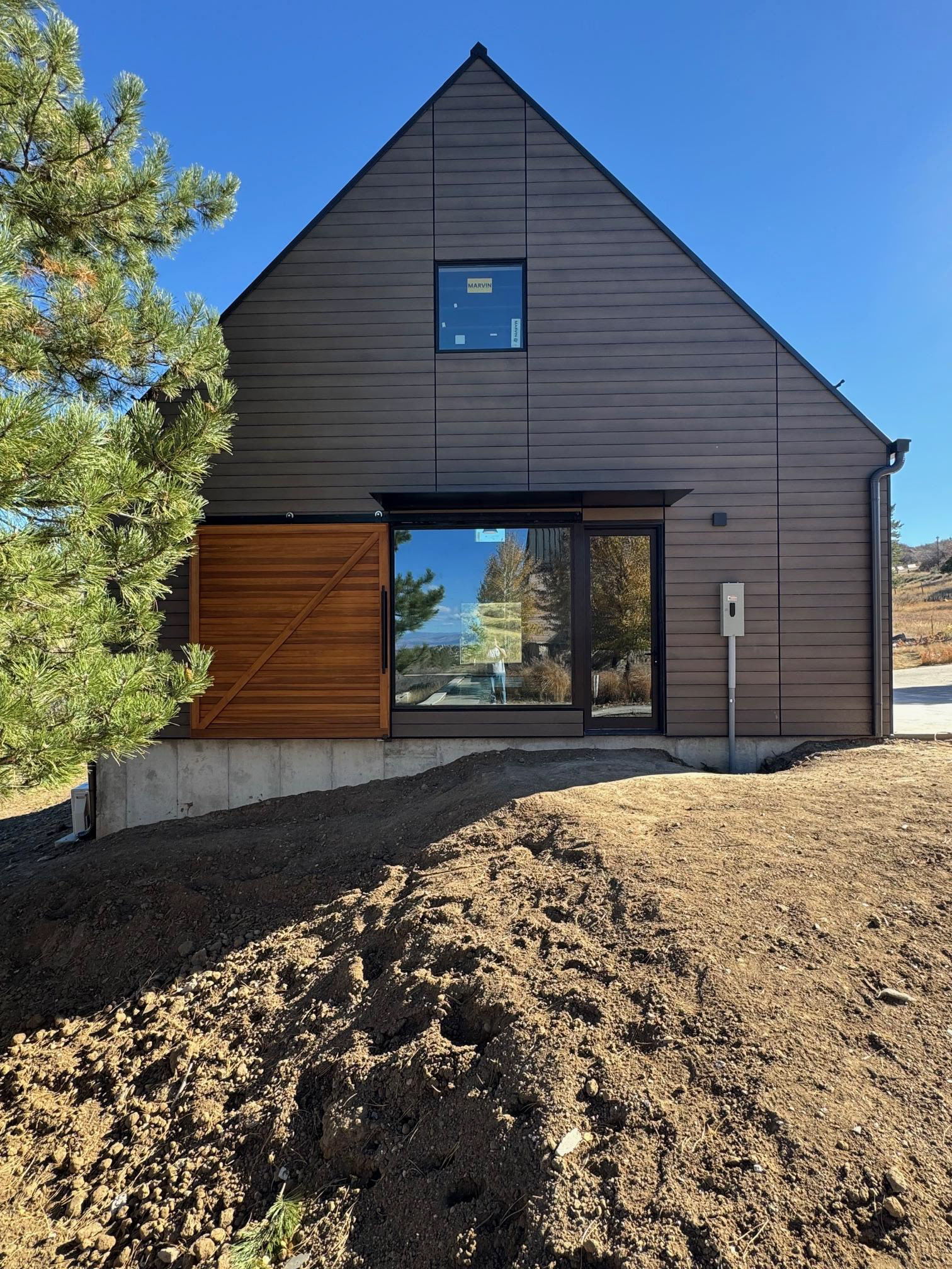 Custom design-build detached barn addition located in Lone Tree, Colorado. Several areas of the construction process was self-performed by WATERMEIER, such as the cedar barn doors fabrication and custom metal awnings and sliding door rail install. This project consists largely of sustainable material practices. The cladding is Resysta Siding, an open joint composite architectural wall cladding. Made from recyclable, wood-free composite material derived from rice husks. The material is made up of approximately 60% rice husks, 22% rock salt, and 18% mineral oil. This design formula offers superior resistance to water, insects, and decay. Another main material is the use of CVG Cedar. Clear vertical grain cedar was utilized for the garage door cladding, custom sliding barn doors we fabricated, and for the vaulted ceiling decking. The gable ends of the facade host large black powder coated awnings and barn door track systems that were designed by us, and submitted and fabricated by a local design build steel fabricator in Denver.