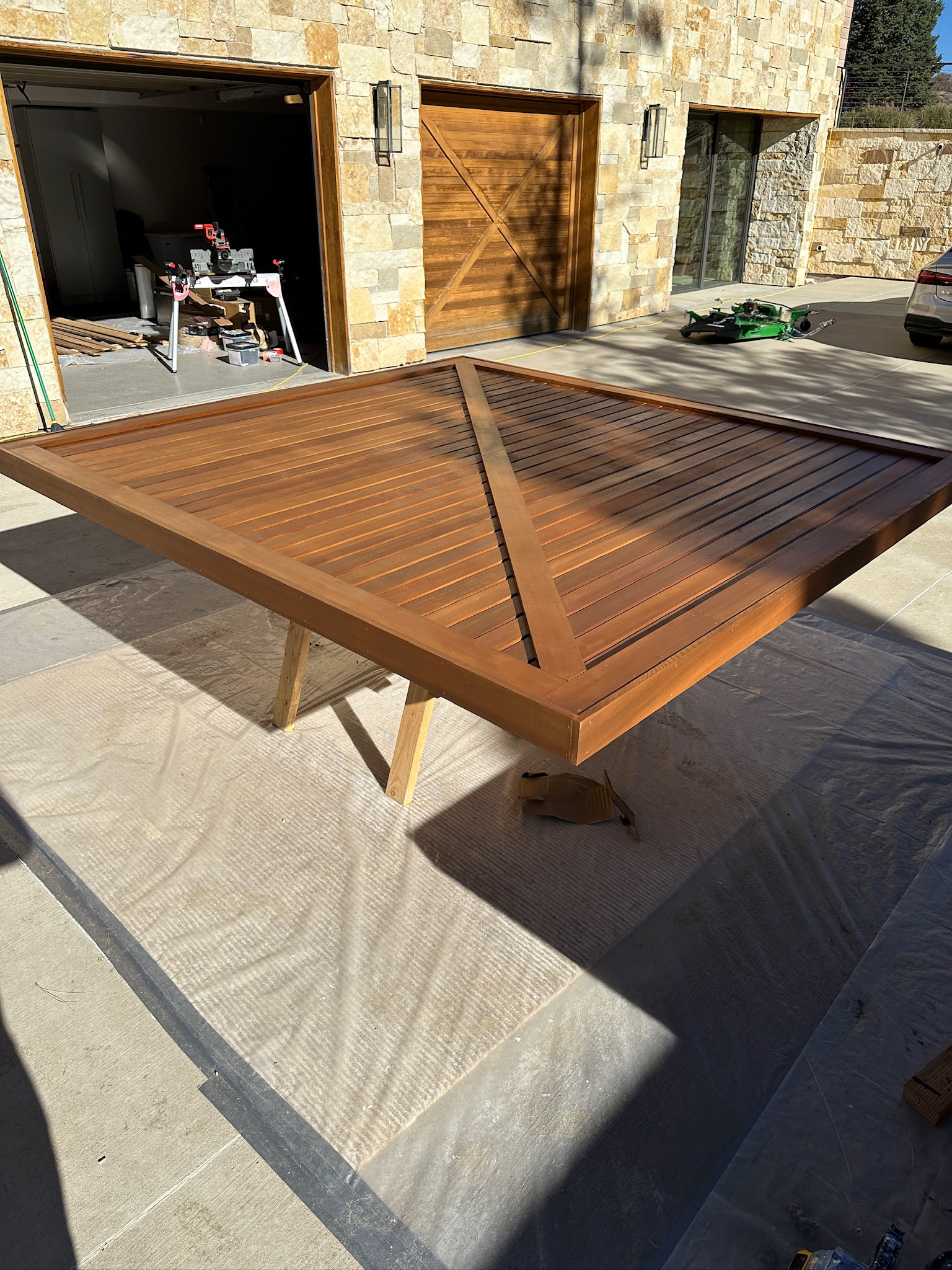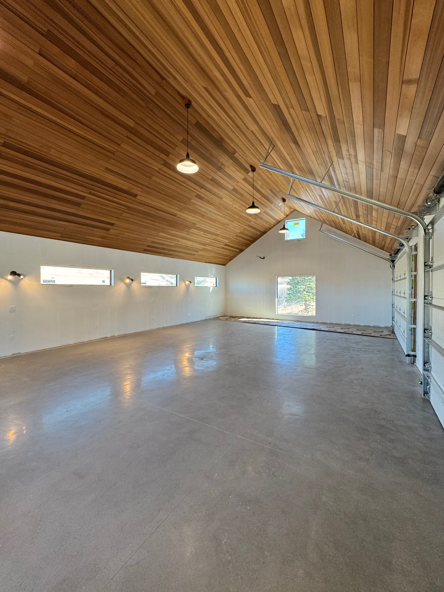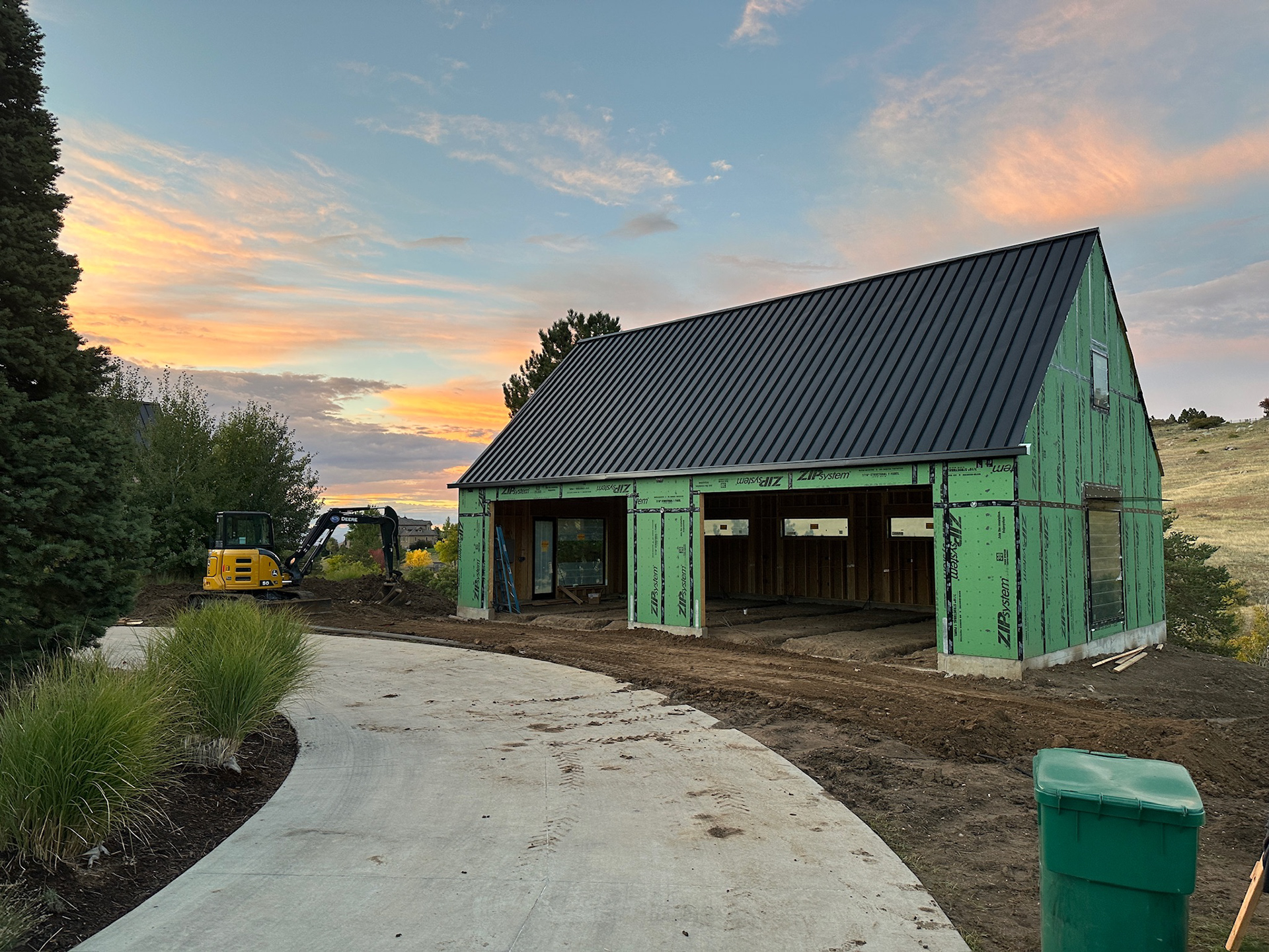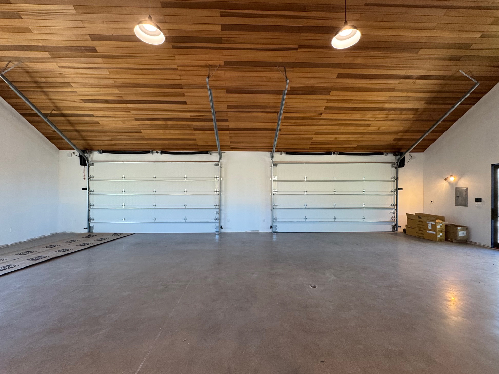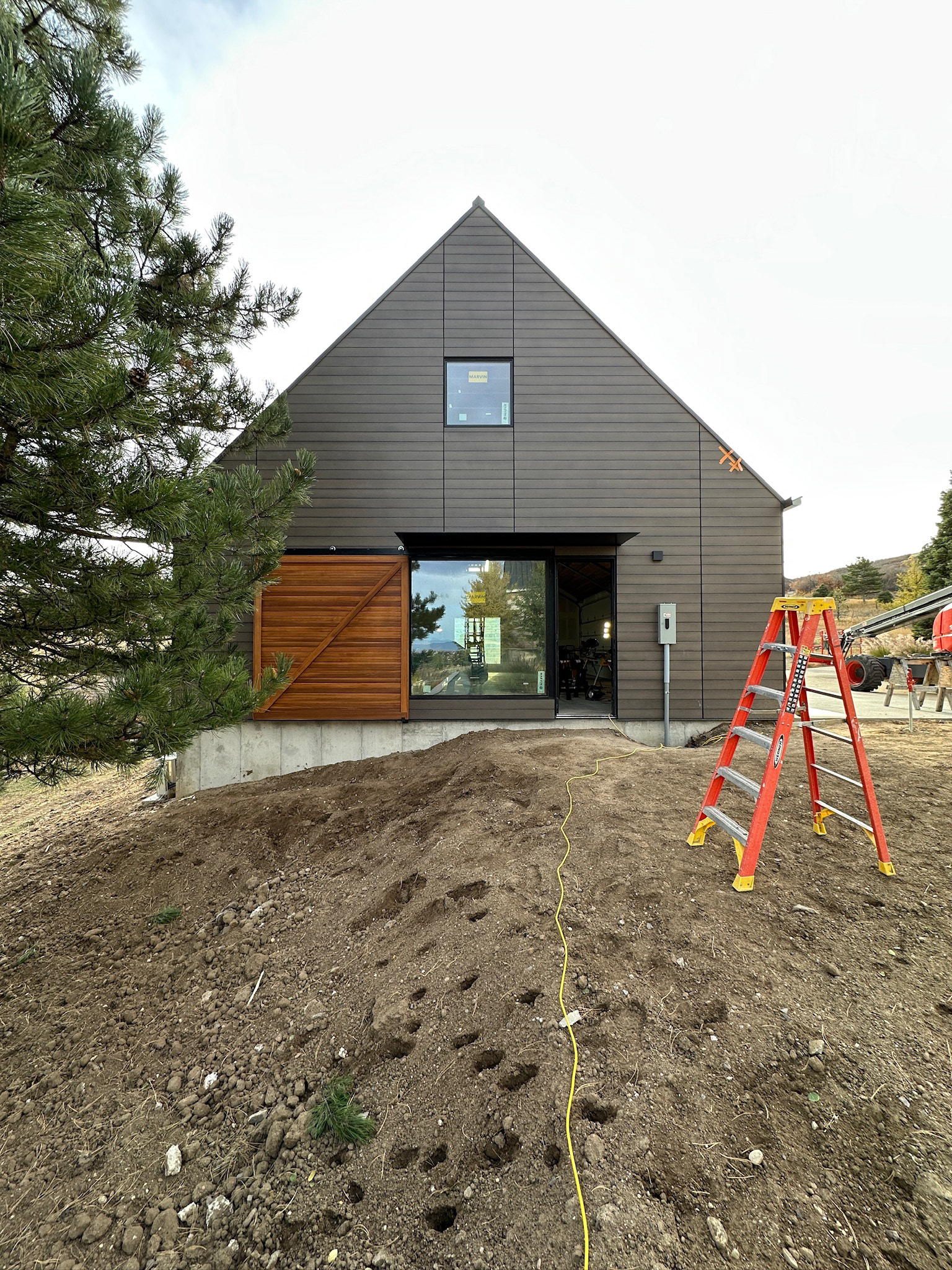 Custom design-build detached barn addition located in Lone Tree, Colorado. Several areas of the construction process was self-performed by WATERMEIER, such as the cedar barn doors fabrication and custom metal awnings and sliding door rail install. This project consists largely of sustainable material practices. The cladding is Resysta Siding, an open joint composite architectural wall cladding. Made from recyclable, wood-free composite material derived from rice husks. The material is made up of approximately 60% rice husks, 22% rock salt, and 18% mineral oil. This design formula offers superior resistance to water, insects, and decay. Another main material is the use of CVG Cedar. Clear vertical grain cedar was utilized for the garage door cladding, custom sliding barn doors we fabricated, and for the vaulted ceiling decking. The gable ends of the facade host large black powder coated awnings and barn door track systems that were designed by us, and submitted and fabricated by a local design build steel fabricator in Denver.