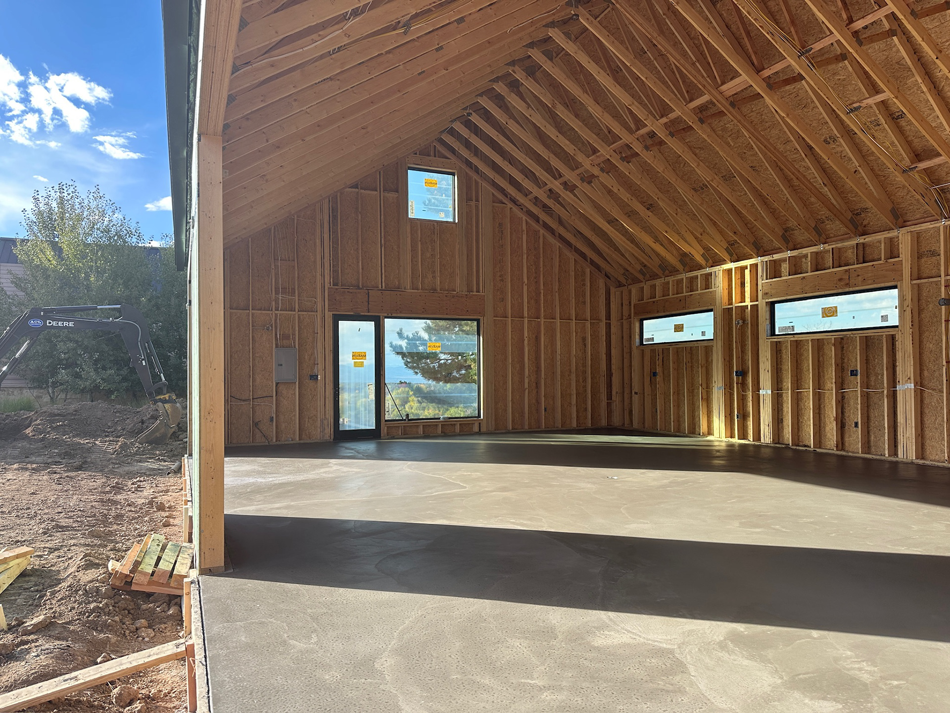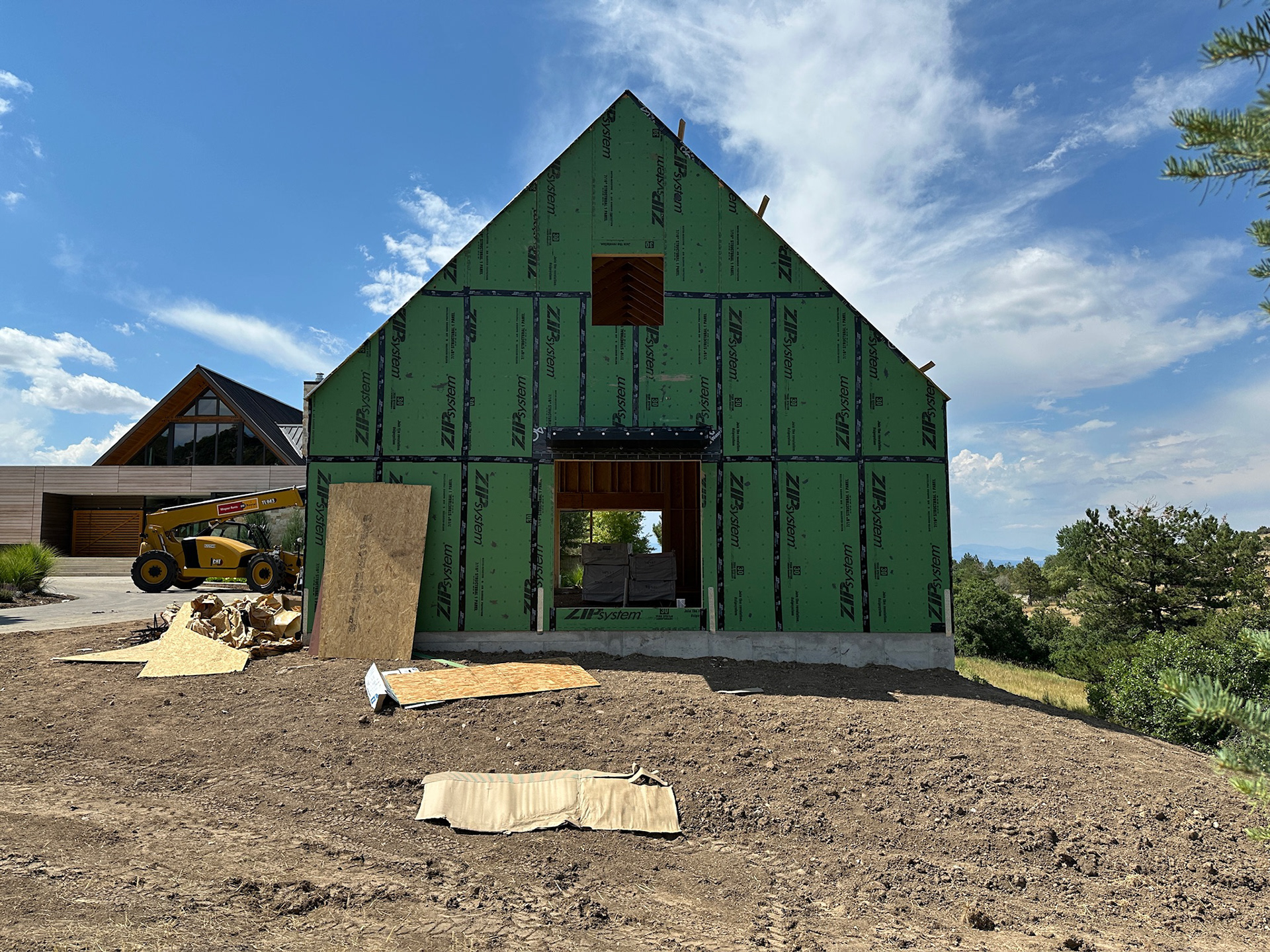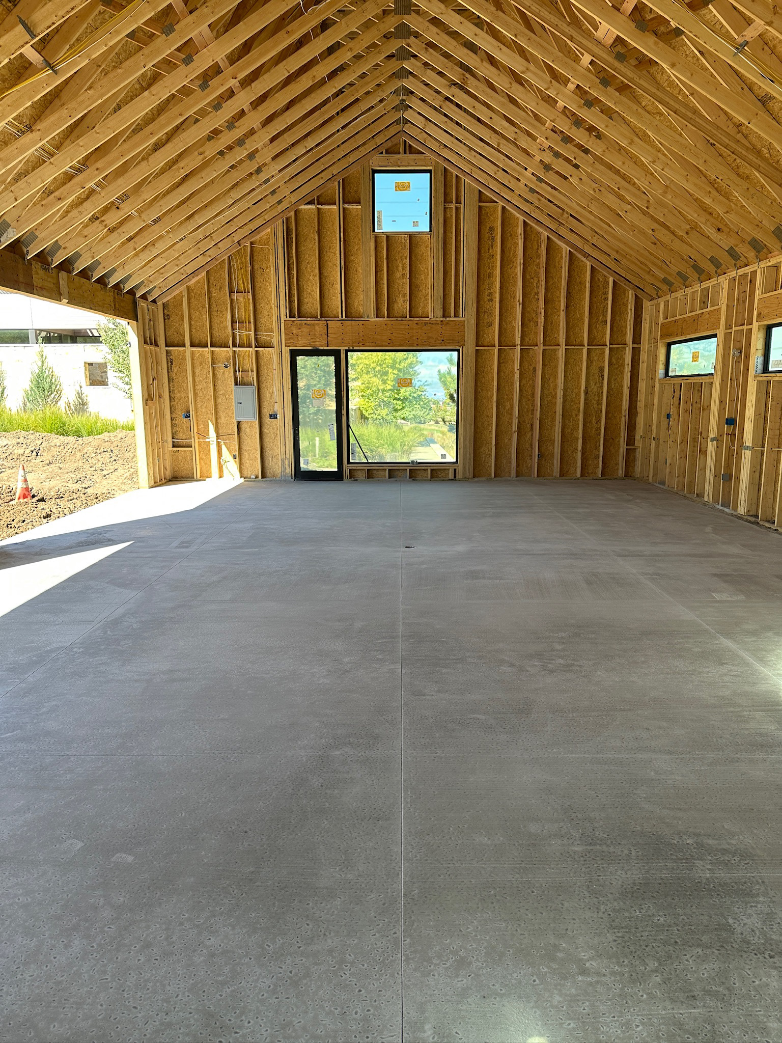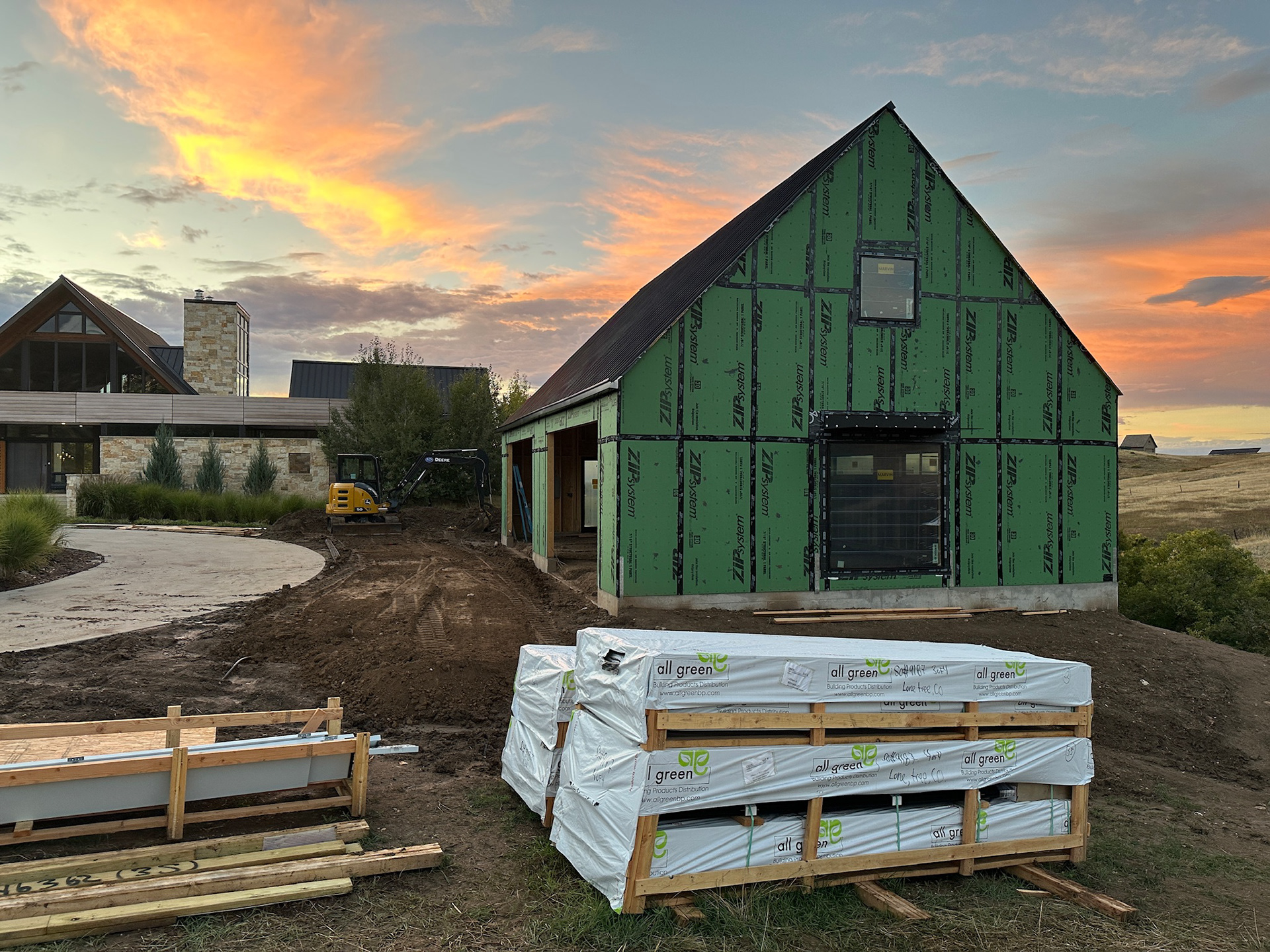 Custom design-build detached barn addition located in Lone Tree, Colorado. Several areas of the construction process was self-performed by WATERMEIER, such as the cedar barn doors fabrication and custom metal awnings and sliding door rail install. This project consists largely of sustainable material practices. The cladding is Resysta Siding, an open joint composite architectural wall cladding. Made from recyclable, wood-free composite material derived from rice husks. The material is made up of approximately 60% rice husks, 22% rock salt, and 18% mineral oil. This design formula offers superior resistance to water, insects, and decay. Another main material is the use of CVG Cedar. Clear vertical grain cedar was utilized for the garage door cladding, custom sliding barn doors we fabricated, and for the vaulted ceiling decking. The gable ends of the facade host large black powder coated awnings and barn door track systems that were designed by us, and submitted and fabricated by a local design build steel fabricator in Denver.